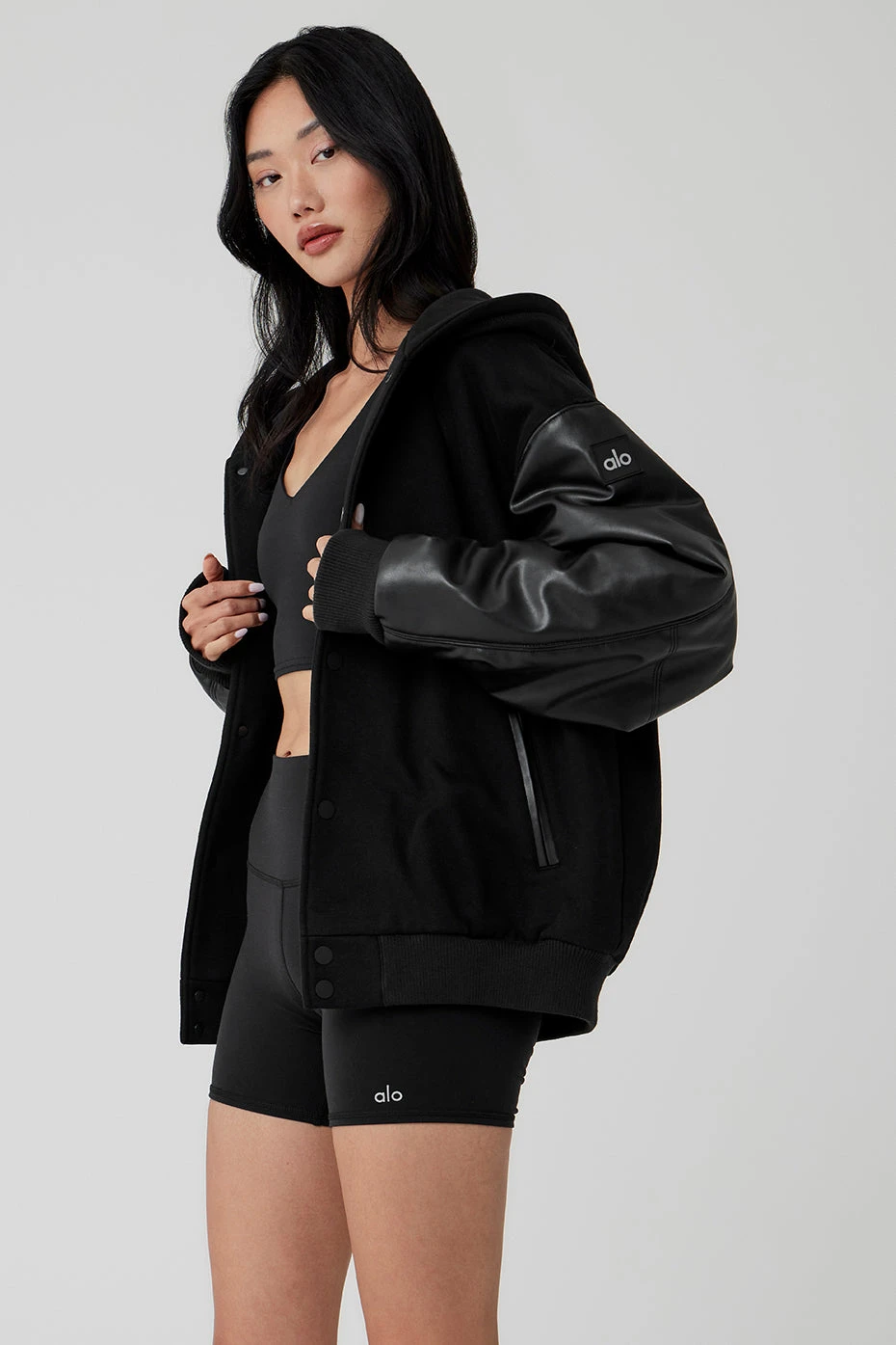 Everybody needs a bomber jacket—especially one like this, that can go from street to sleek in the blink of an eye. It has a slightly oversized fit that hits at the high hip with a heavyweight French terry body and lightly filled faux leather sleeves. The ribbed hem and cuffs keep cold air out, and it’s finished with matte snaps, side pockets and a wind-defying hood. Grab yours and get ready to wear it on repeat.